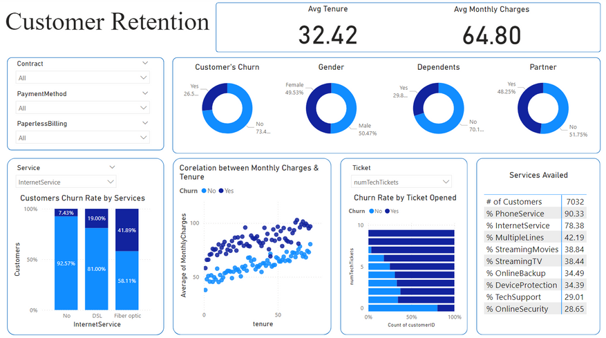 Customer Churn Rate Analysis Dashboard is an interactive tool designed to help businesses monitor and analyze customer retention patterns. This comprehensive dashboard provides key insights into customer churn, enabling companies to identify trends, evaluate the effectiveness of their services, and implement strategies to reduce churn rates. The dashboard visualizes critical metrics such as average tenure, monthly charges, gender distribution, churn correlation with services, and the impact of customer support interactions, making it an essential resource for data-driven decision-making.